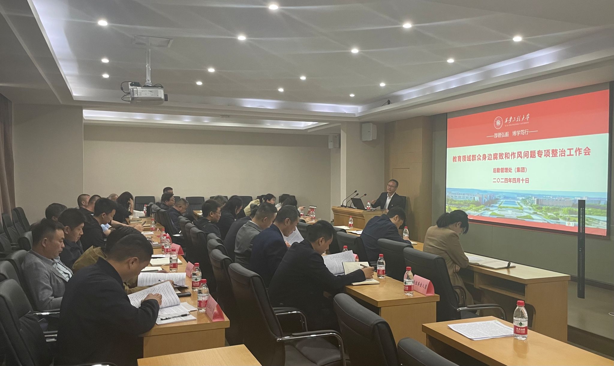 4月10日上午,后勤管理处(集团)在临潼校区行政楼321会议室召开教育领域群众身边腐败和作风问题专项整治工作会,进一步推动后勤领域集中整治,凝聚工作合力,营造风清气正的服务保障环境。校党委副书记殷永建出席并讲话,后勤管理处(集团)党政领导班子成员,后勤所属各科室(中心)负责人,餐饮、物业等13家驻校第三方服务企业负责人等20余人参加会议。会议由后勤管理处(集团)党总支书记杨森主持。会上,杨森对《中国共产...