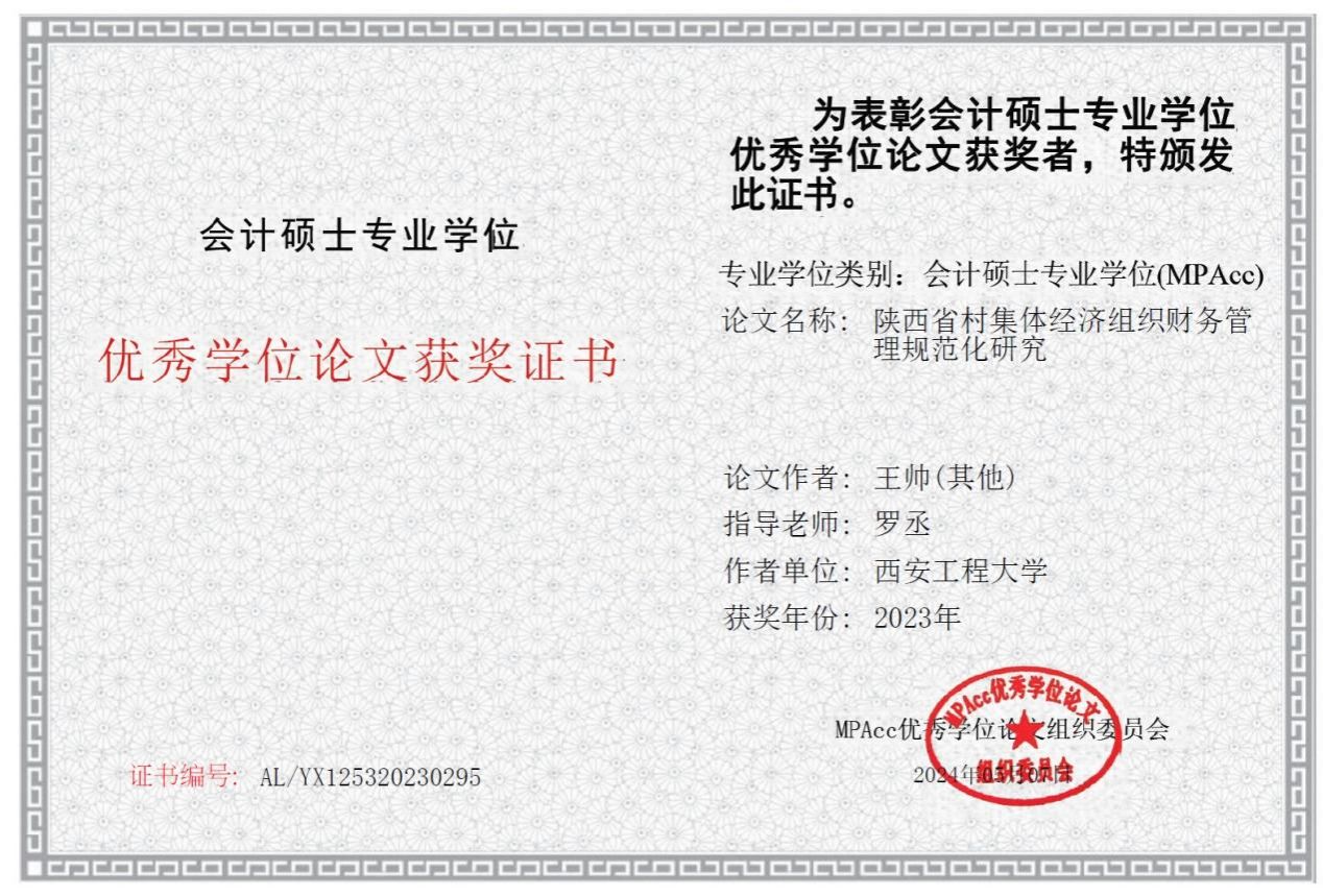 近日,全国会计专业学位研究生教育指导委员会公布了2023年全国MPAcc优秀学位论文评选结果。PP电子管理学院研究生王帅同学撰写的《陕西省村集体经济组织财务管理规范化研究》(指导老师:罗丞)获评优秀学位论文。这是PP电子首次获得全国MPAcc优秀学位论文,该论文也是2023年陕西省唯一一篇入选的MPAcc优秀学位论文。全国MPAcc优秀学位论文评选由全国会计专业学位研究生教育指导委员会指导,MPAcc优秀学位论文组织委员会主办并联合多...