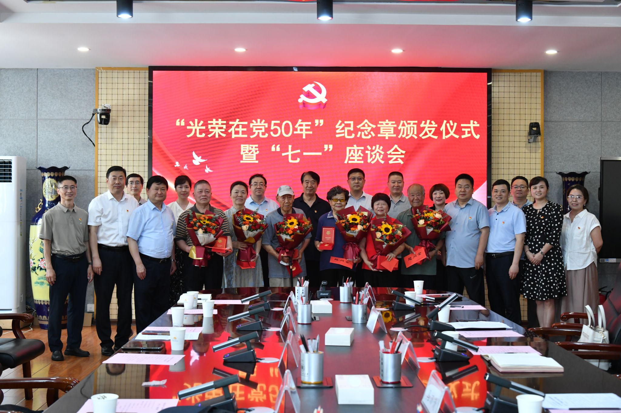 7月1日下午,PP电子在金花校区第三会议室举办“光荣在党50年”纪念章颁发仪式暨“七一”座谈会。校领导马万清、井浩、殷永建出席会议。党委相关职能部门负责人、部分院(部)级党组织书记、“光荣在党50年”老党员、师生党员代表参加会议。校领导为6位“光荣在党50年”老党员颁发了纪念章,并赠送鲜花和慰问金。朱宝瑜、魏爱莲两位老师作为老党员代表发言,追忆西纺岁月,讲述入党初心,感怀中国共产党带领全国人民接续奋斗的伟大...