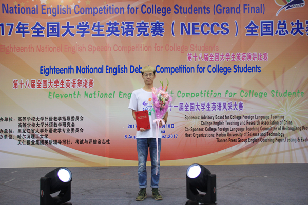 2017年全国大学生英语竞赛(NECCS)全国总决赛于8月6至8月10日在哈尔滨理工大学举办。此次总决赛由高等学校大学外语教学指导委员会和高等学校大学外语教学研究会主办。在PP电子教务处,学生处、校团委和人文学院的大力支持下,PP电子选手钱江涛同学通过大学英语教学部陈西亚老师精心指导,经层层选拔,获得代表陕西赛区参加此项体现中国大学生英语最高水平赛事的资格,并在总决赛中取得佳绩。