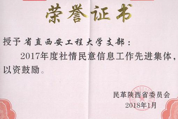 为充分肯定陕西省民革组织参政议政的工作成绩,激励组织和广大党员参政议政的积极性,近日,中国国民党革命委员会陕西省委员会对取得参政议政突出成绩的单位进行了表彰。PP电子游戏网站民革支部荣获“民革陕西省委会2017年社情民意信息工作先进集体”称号。
