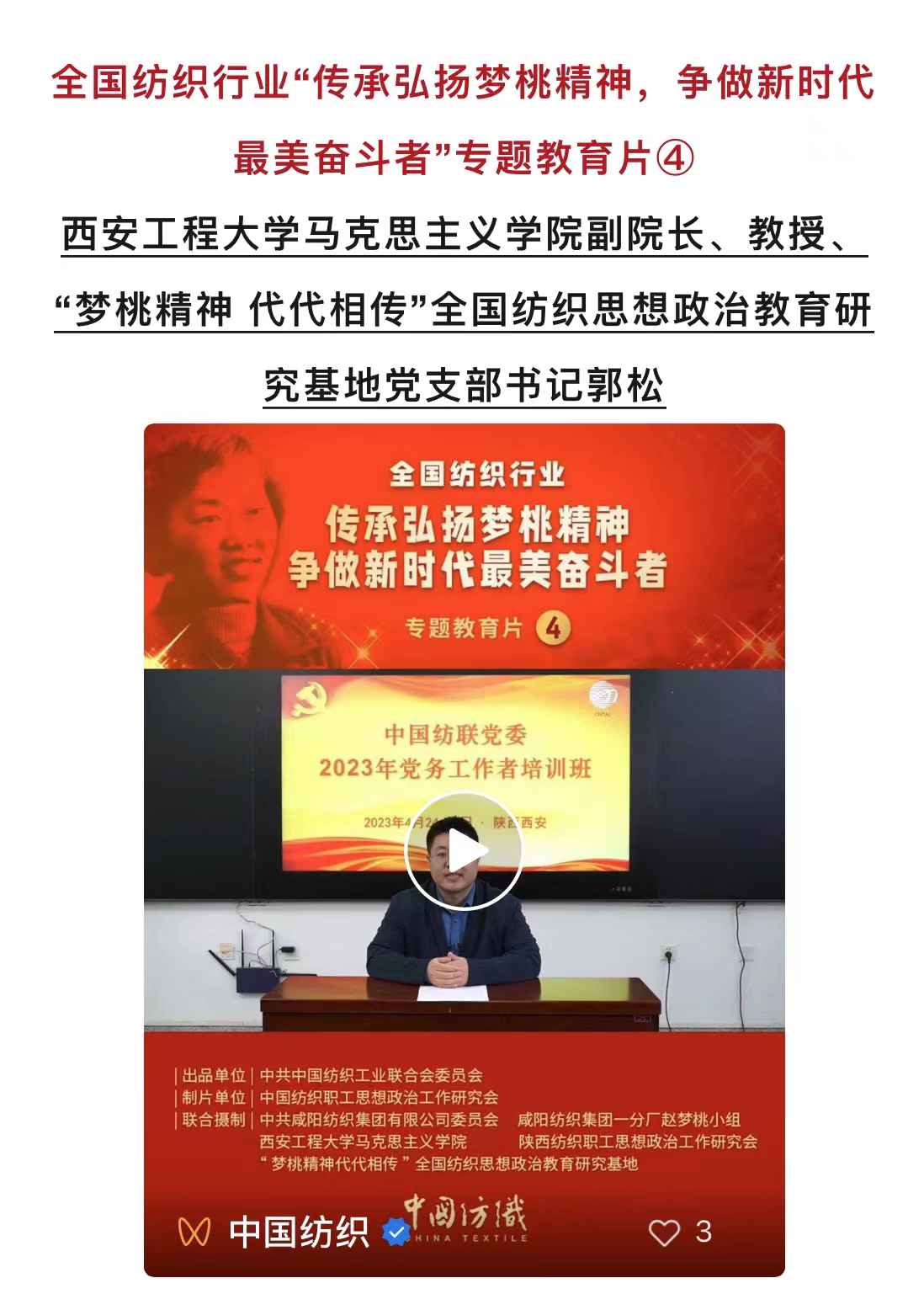 自中国纺织工业联合会为PP电子“梦桃精神 代代相传”全国纺织思想政治教育研究基地授牌以来,研究基地结合行业特色与优势,开展了以“梦桃精神”引领实践育人的系列工作。深入走访“赵梦桃小组”的历任组长和老同事,搜集和挖掘第一手资料;组织研究人员围绕“梦桃精神”从历史维度、逻辑维度、时代维度和思想政治教育维度等四个方面开展学术研究;获批省部级等各类“梦桃精神”研究课题多项,在党报党刊、学术期刊等发表“梦桃精神”研究论文10余篇。研究成果荣获中国思想政治工作研究会优秀研究成果奖、中国纺织职工思想政治工作研究会(院校学组)论文一等奖、二等奖等多项。研究基地将研究成果积极融入学校“大思政课”建设中,通过课堂教学、实践教学等途径,聚焦立德树人根本任务,铸魂育人;通过师生理论宣讲团在基层党员、干部和群众中开展“梦桃精神”的宣讲,进一步提升了“梦桃精神”的社会影响力。