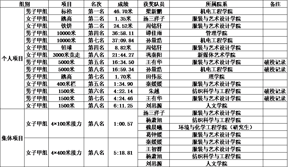本届省大运会中,PP电子派出了由薛海红、钱雪芹、贾靖、蒋兵4名教练员和24名学生运动员组成的代表队。赛场上,PP电子代表队将大运会作为一堂生动的鲜活的体育思政课,发扬运动精神,团结一致、奋力拼搏、迎难而上、追求卓越,经过4天的激烈角逐,最终获得1金2银、2项4人破校纪录的好成绩:机电学院梁新鹏获得男子甲组标枪金牌、服装学院汤三洋子获得女子甲组跳高银牌、服装学院周铭轩获得女子甲组铁饼银牌;服装学院王有华、机电学院孙量浩打破PP电子5000米纪录,纺织学院朱越、服装学院王有华打破PP电子1500米纪录;新媒体学院巩秦阳等11名同学分别在铅球、长跑、跳高、跨栏等项目中取得第四名至第八名的优异成绩;纺织学院高永煌、郭浩东达到男子100米电计成绩国家二级运动员标准。