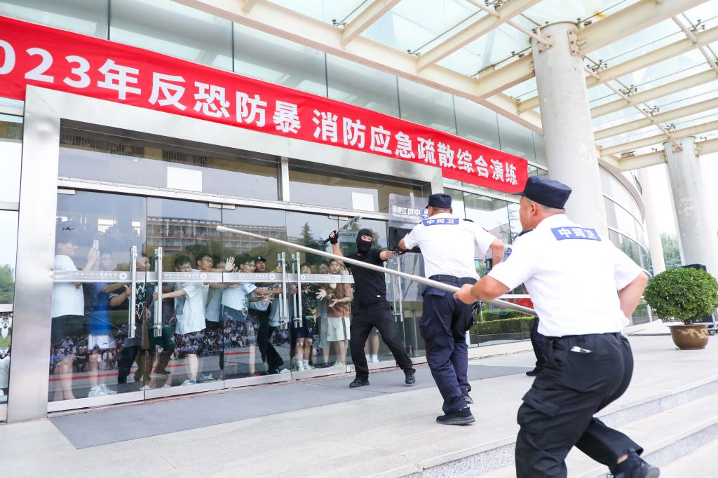 在反恐防暴演练单元,一名“暴恐分子”突然手持器械闯入学校,流窜到图书馆附近试图伤害在校师生并伺机制造暴恐事件,门禁值班人员发现后第一时间汇报并报警,巡逻保安人员接到指令后迅速引导图书馆周边学生进入室内躲避,使用警棍盾牌及钢叉围堵控制“暴恐分子”,5分钟后,斜口派出所民警迅速到达现场,与学校安保人员协同配合,成功将“暴恐分子”制服。