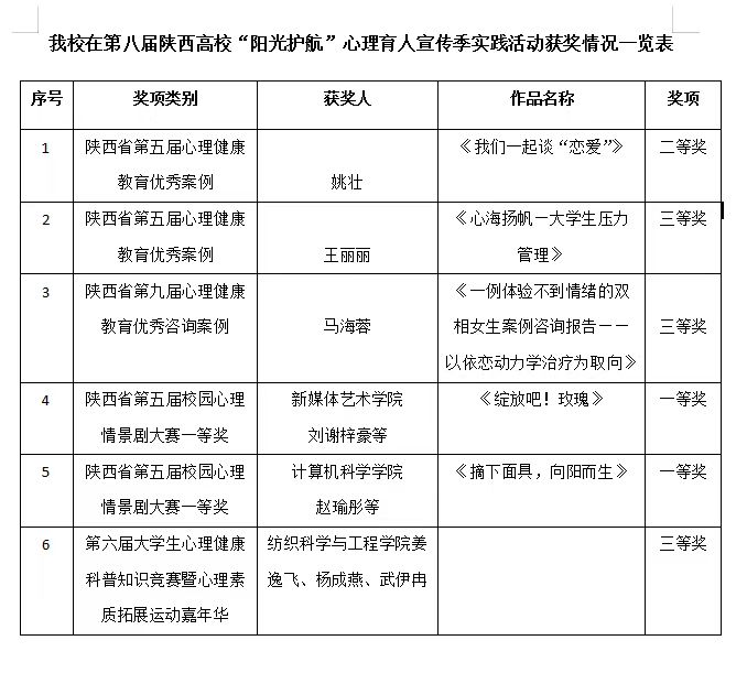 近日,中共陕西省委教育工委通报第八届陕西高校“阳光护航”心理育人宣传季省级有关活动获奖情况,PP电子共有有6项获奖,其中,一等奖2项、二等奖1项、三等奖3项。