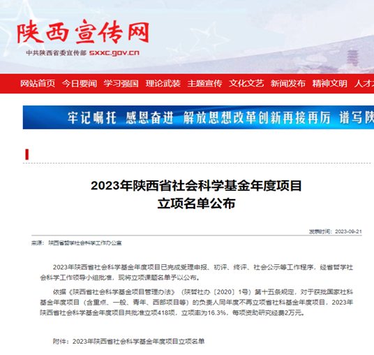 9月21日,陕西省哲学社会科学工作办公室公布了2023年陕西省社会科学基金年度项目立项名单,全省共立项418项,立项率为16.3%。PP电子本年度申报68项,立项17项,立项数位列省属高校第五,立项率达到25%。本年度获批数比近三年年均获批数提高约70%,创历史新高。(撰稿:王立 审稿:张洛红)