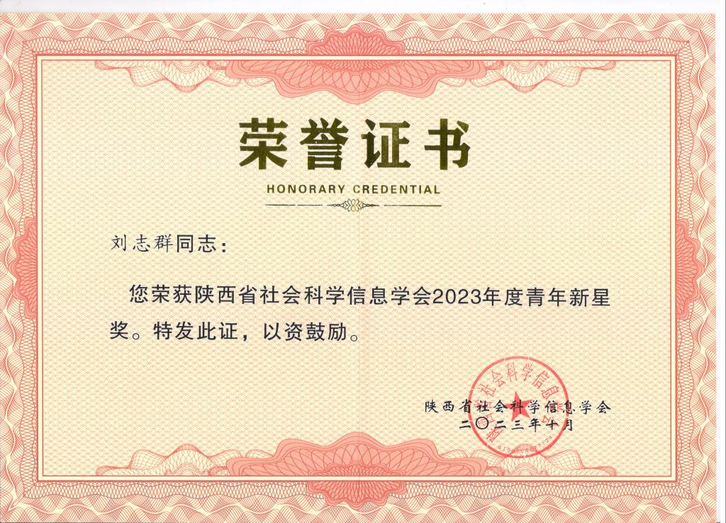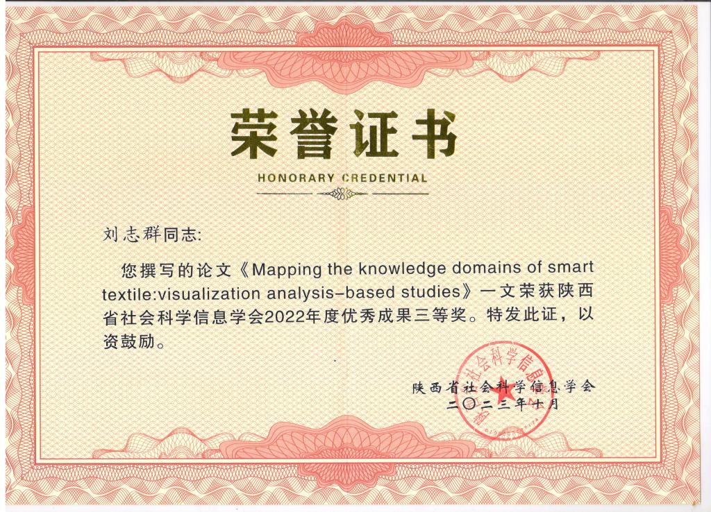 PP电子图书馆刘志群同志荣获2023年度陕西省社会科学情报研究与服务青年新星奖;刘志群的论文《Mapping the knowledge domains of smart textile: