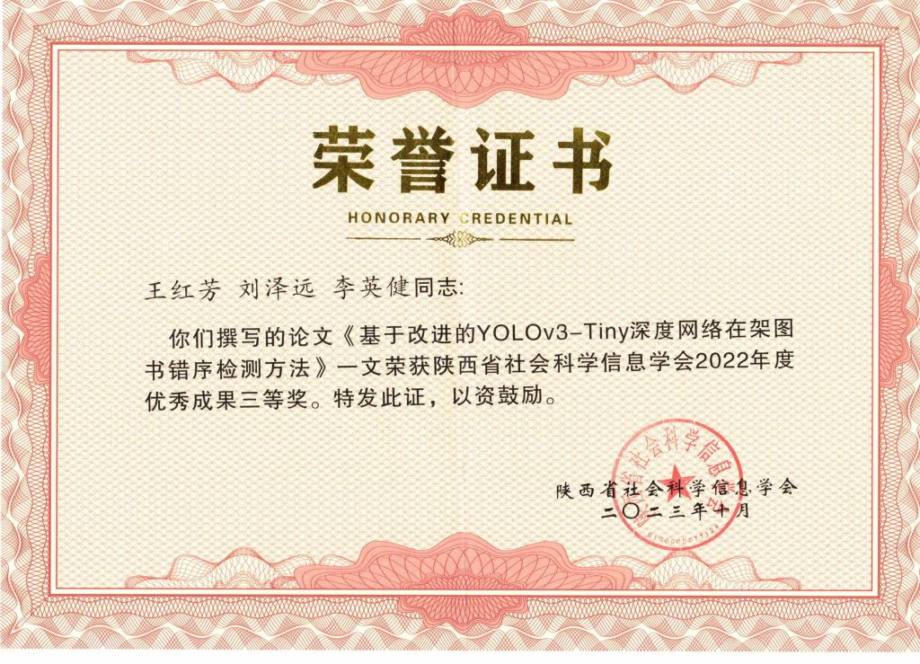 visualization analysis-based studies》和王红芳的论文《基于改进的YOLOv3-Tiny 深度网络在架图书错序检测方法》均获得2022年度优秀成果奖三等奖。