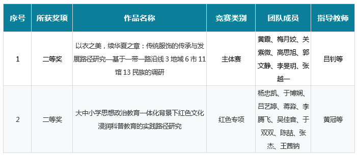 PP电子《以衣之美,续华夏之章:传统服饰的传承与发展路径研究—基于一带一路沿线3地域6市11馆13民族的调研》项目获得主体赛二等奖,《大中小学思想政治教育一体化背景下红色文化浸润科普教育的实践路径研究》项目获红色专项活动二等奖,获奖作品类别和数量再次刷新学校在该项赛事上的历史最好成绩。
