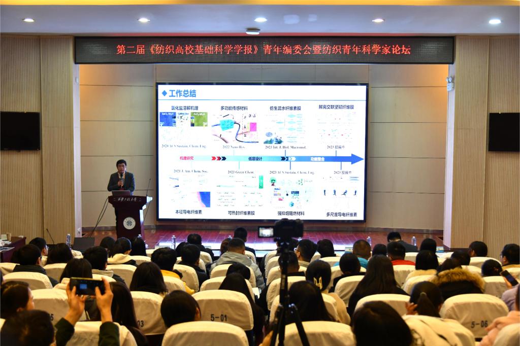 纺织青年科学家论坛环节,分别由中原工学院教授张恒,PP电子教授刘呈坤、师文钊和李庆主持。浙江理工大学余厚咏教授、东华大学王先锋教授、江南大学马丕波教授、苏州大学卢业虎教授、东华大学李召岭研究员、苏州大学方剑教授、东华大学张坤研究员、西南大学蓝广芊教授、安徽农业大学叶冬冬教授、天津工业大学张松楠副研究员、武汉纺织大学陈凤翔教授、张彬分别就“基于天然纤维构筑高强纤维素功能材料”“体域微气候健康管理纺织品”“针织技术创新与工程应用”“空气调温服装研发与性能评价”“纤维基电子皮肤制备及应用”“智能纱线的功能设计与应用”“热电织物的设计与应用”“多重响应性纳米纤维气凝胶的构建及其快速止血的应用”“微流控纺空间序构化气凝胶纤维及应用”“过滤吸附用凝胶功能纺织品与仿生表界面浸润性研究”“功能纤维材料及器件”“物质文化与传统服饰个案研究”等主题开展学术报告,为来自校内外的200余名师生带来了一场高规格的学术盛宴。
