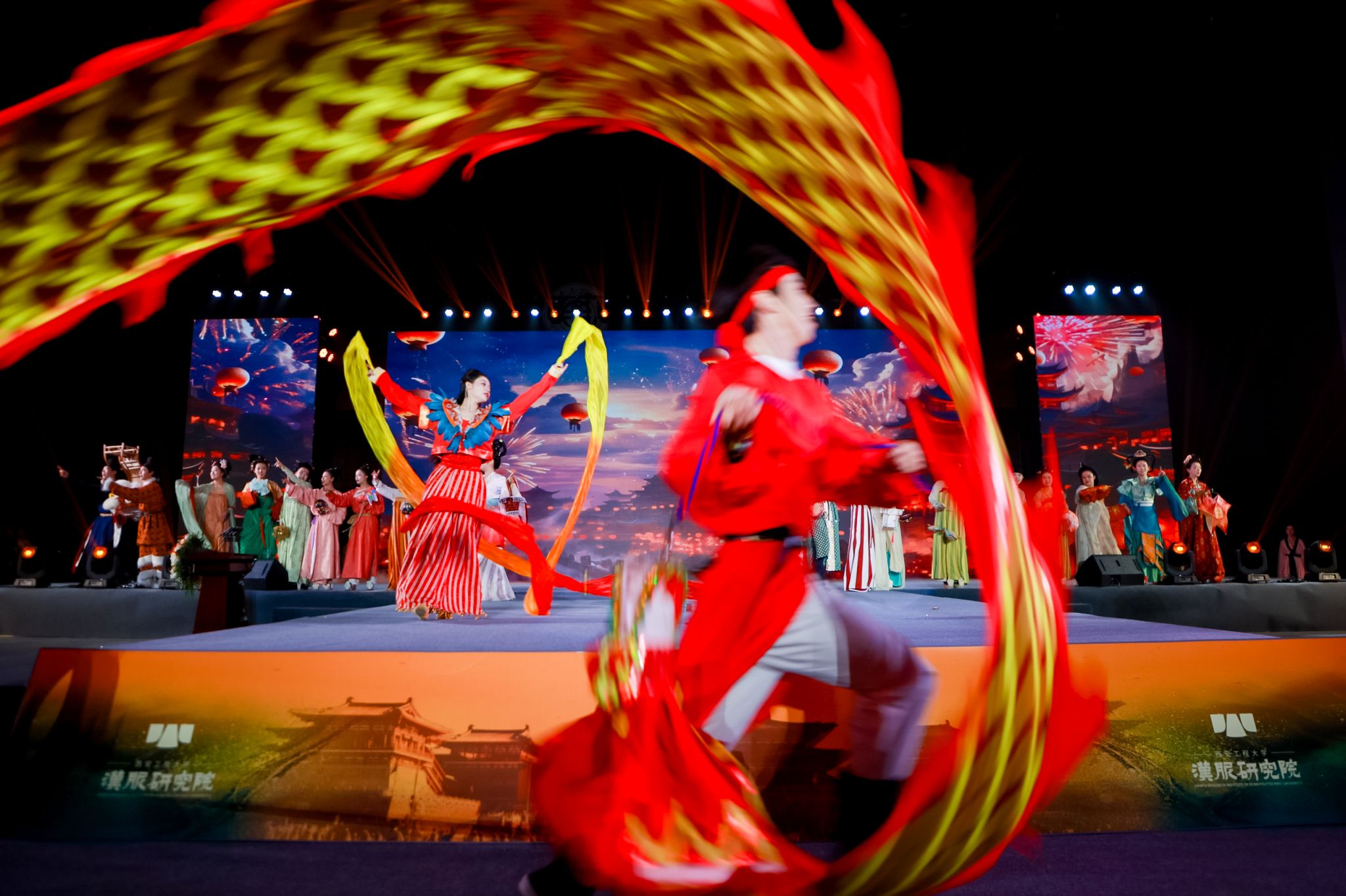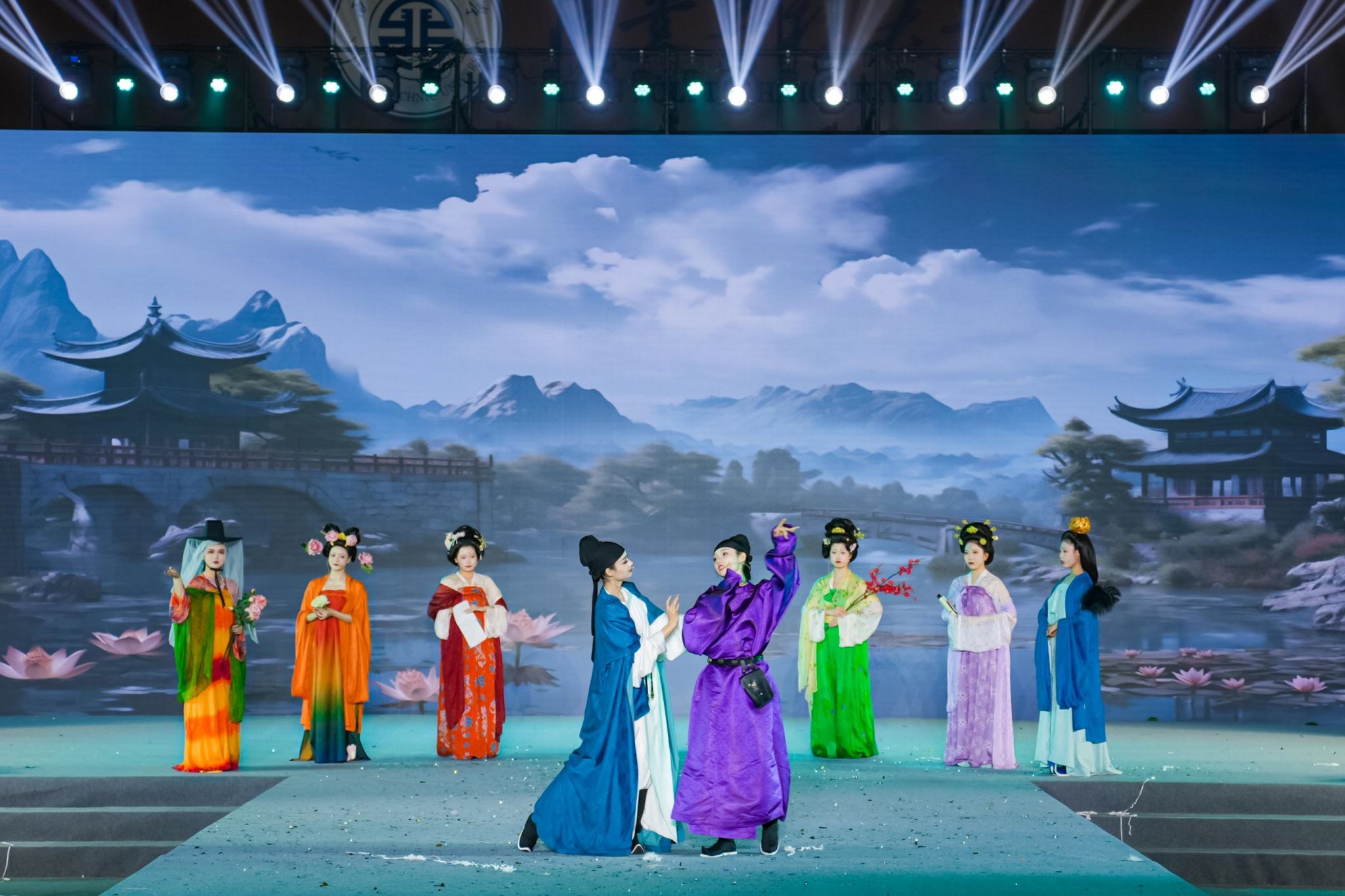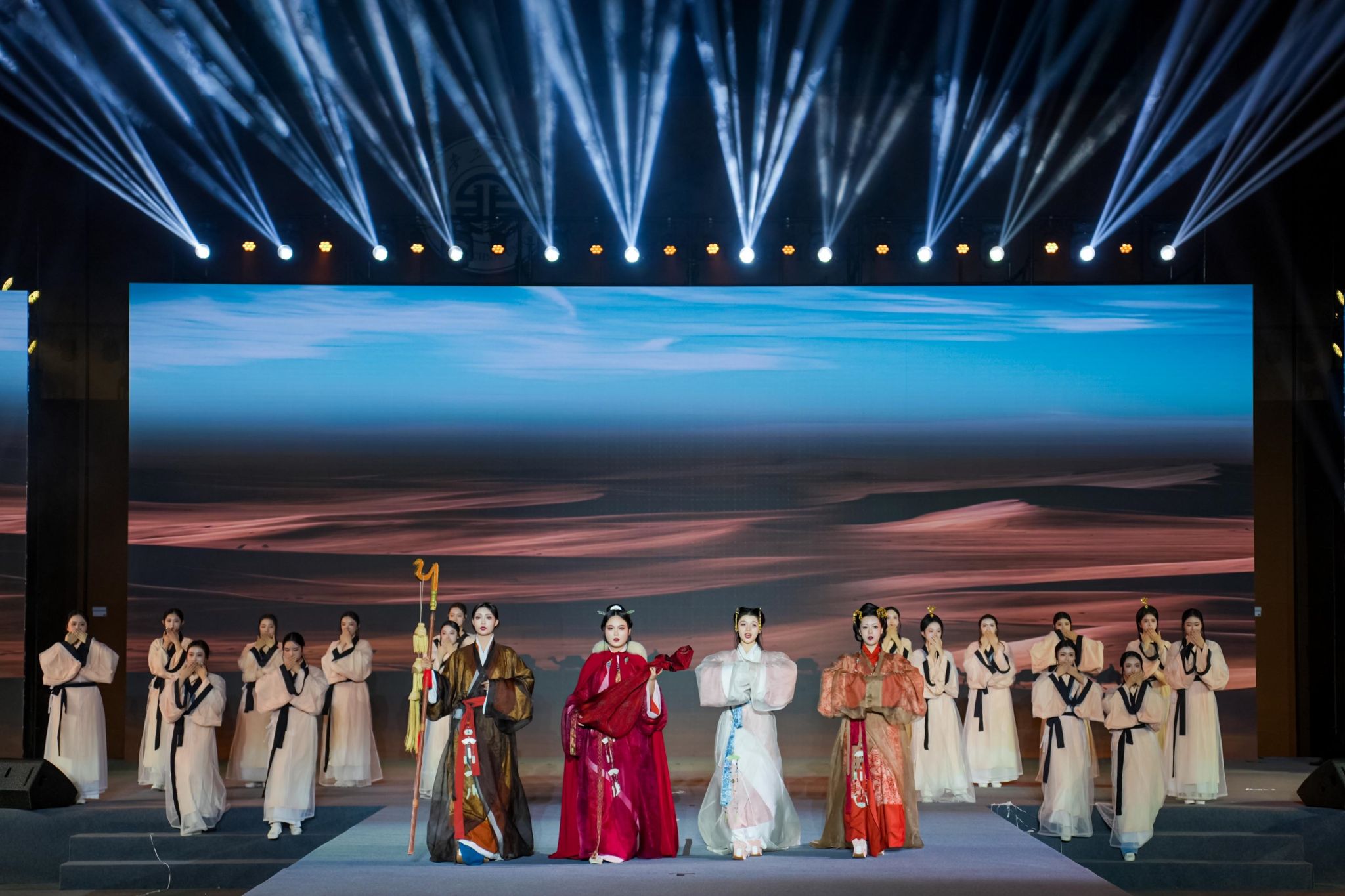 展演环节,“礼乐长安 华夏霓裳”汉服新品及情景剧首次与观众见面,为与会嘉宾献上一台融合传统与时尚的诗乐文化盛宴。本次演出以衣冠礼乐传承华夏文明为主题,共分为桑林晚照、丝路群芳、盛唐流光、羽衣霓裳、巾帼意气、文采风流等六个篇章,整场演出由PP电子师生自编、自导、自演,服饰均由师生从陕西历史文物中发现并获得灵感进行设计、加工、制作后,以声、色、乐、舞、诗等艺术形式创造性地演绎一篇篇绝美华章。璀璨夺目的场景、声情并茂的演绎,博得了大家的阵阵掌声。