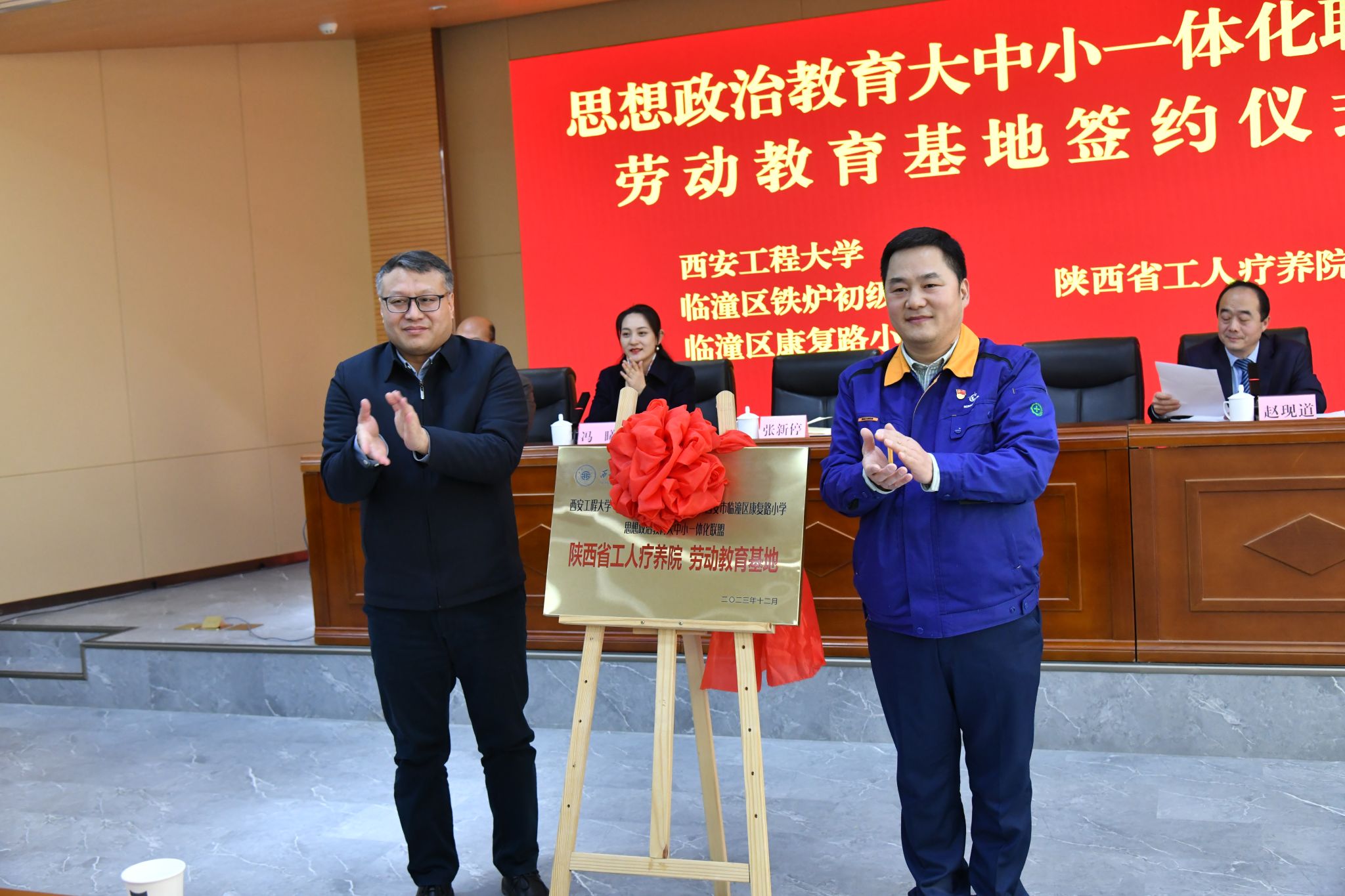 杨建与张新停共同为“劳动实践教育基地”揭牌。学生工作部(处)部长王志、陕西省工人疗养院院长助理赵冰、铁炉初级中学校长杨小峰、康复路小学校长宋剑秋代表共同签约。