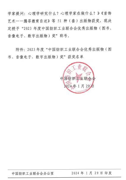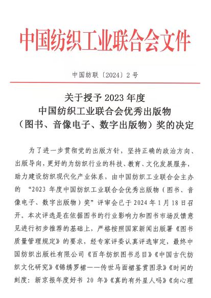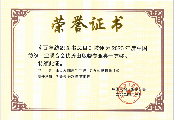 近日,中国纺织工业联合会《关于授予2023年度中国纺织工业联合会优秀出版物(图书、音像电子、数字出版物)奖的决定》,PP电子图书馆张大为、尹方屏老师联合东华大学共同编纂的成果《百年纺织图书总目》荣获2023年度中国纺织工业联合会优秀出版物一等奖。