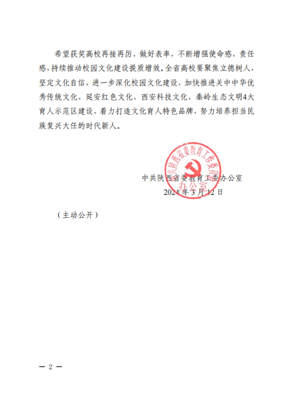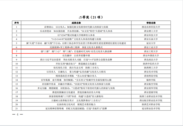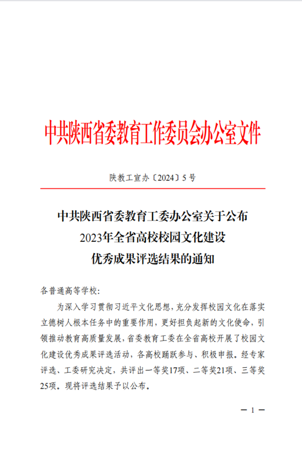 省委教育工委于2023年12月在全省高校开展了校园文化建设优秀成果评选活动。经高校申报、专家评选,工委研究决定,评选出2023年全省高校校园文化建设优秀成果一等奖17项、二等奖21项、三等奖25项。《强“三基” 凝“三心” 铸“三魂”:打造新时代 XPU 红色文化育人新品牌》项目结合学院学科特色,以构建“三项机制”为保障,与党史学习教育、基层党组织规范化建设、“一站式”学生社区建设相结合机制,强化思想之基、政治之基、成长之基;以创建“三大品牌”为抓手,通过红色文化学习班、红色故事会、红色小剧目,凝聚爱国之心、奉献之心、为民之心;以实现“三项融合”为目标,与大学生日常思政教育、学院事业发展、“五育工程”相融合,铸牢精神之魂、奋斗之魂、理想之魂,师德思政教育“活”起来,示范引领“亮”起来,人才培养“强”起来,事业发展“快”起来。