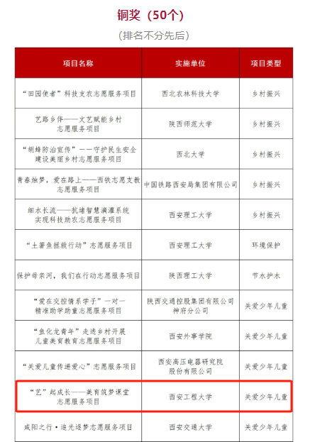 近日,由共青团陕西省委、省委社会工作部、省交通运输厅、省水利厅、省文化和旅游厅、省卫生健康委等单位共同指导,陕西省青年志愿者协会主办的“陕西省第一届青年志愿服务项目大赛”公示获奖项目名单,PP电子选送的4组参赛作品喜获1金、2银、1铜的好成绩,其中《云端筑梦师——科普启智帮教助学志愿服务项目》荣获金奖,《“紫阳小郎君”返乡助力乡村振兴志愿服务实践项目》《“‘芯’心相印,与爱同行”回收废旧笔芯志愿服务项目》荣获银奖,《“艺”起成长——美育筑梦课堂志愿服务项目》荣获铜奖。