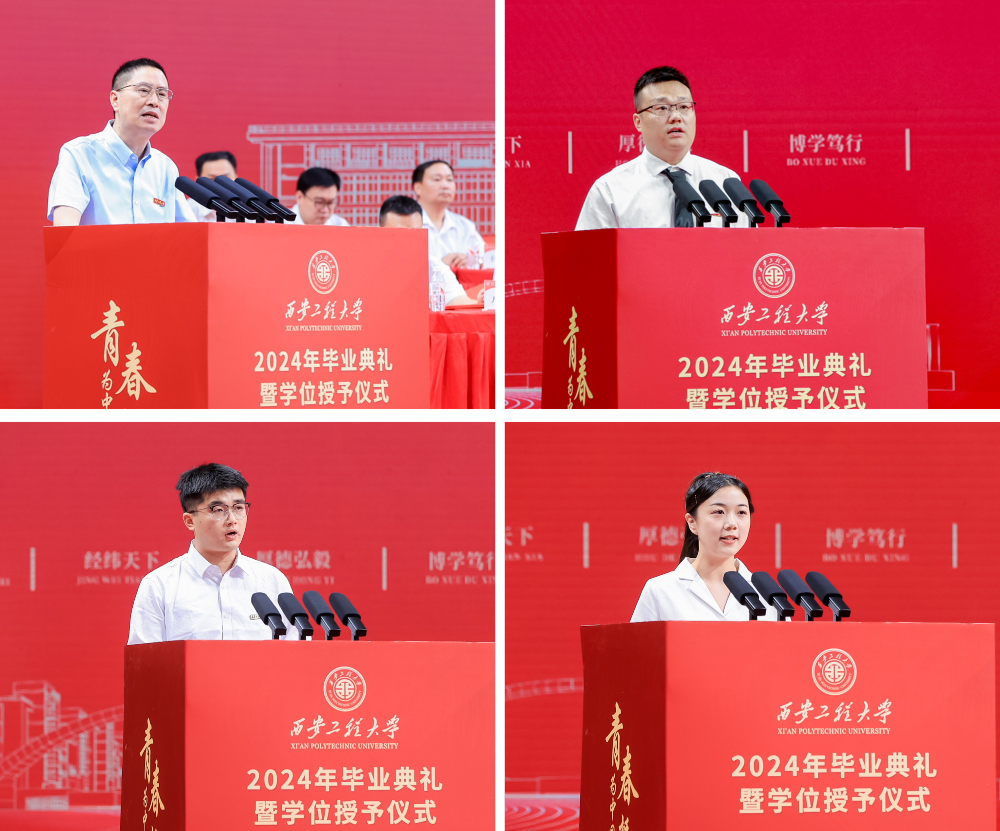 毕业本科生代表、机电工程学院2020级智能制造工程2班本科生袁馨回顾了在西工程大的宝贵瞬间,表示只要敢于坚持挑战,化阻碍为磨砺,就能如江河穿越崇山峻岭之后迎来彩彻区明,希望同学们将自己个人“小目标”融入党和国家的“大蓝图”,在时代浪潮中以微毫诠释盛大。