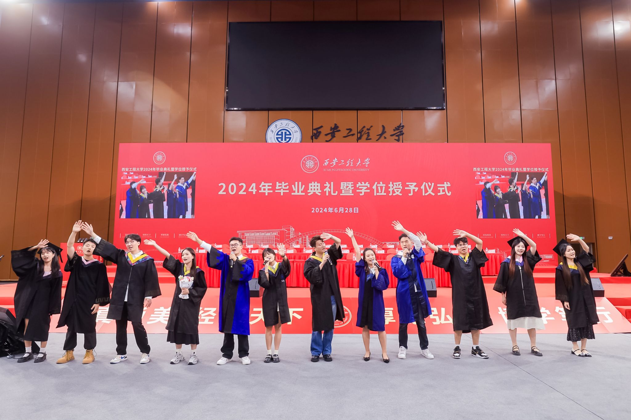 典礼开始前,毕业生代表献上了精彩的暖场表演。《我们一起闯》《像你这样的朋友》《最好的我们》《去明天》《入海》……宛转悠扬的旋律响起,再次唤起同学们大学时光的美好回忆,欢呼声与热烈的掌声将现场气氛瞬间点燃。