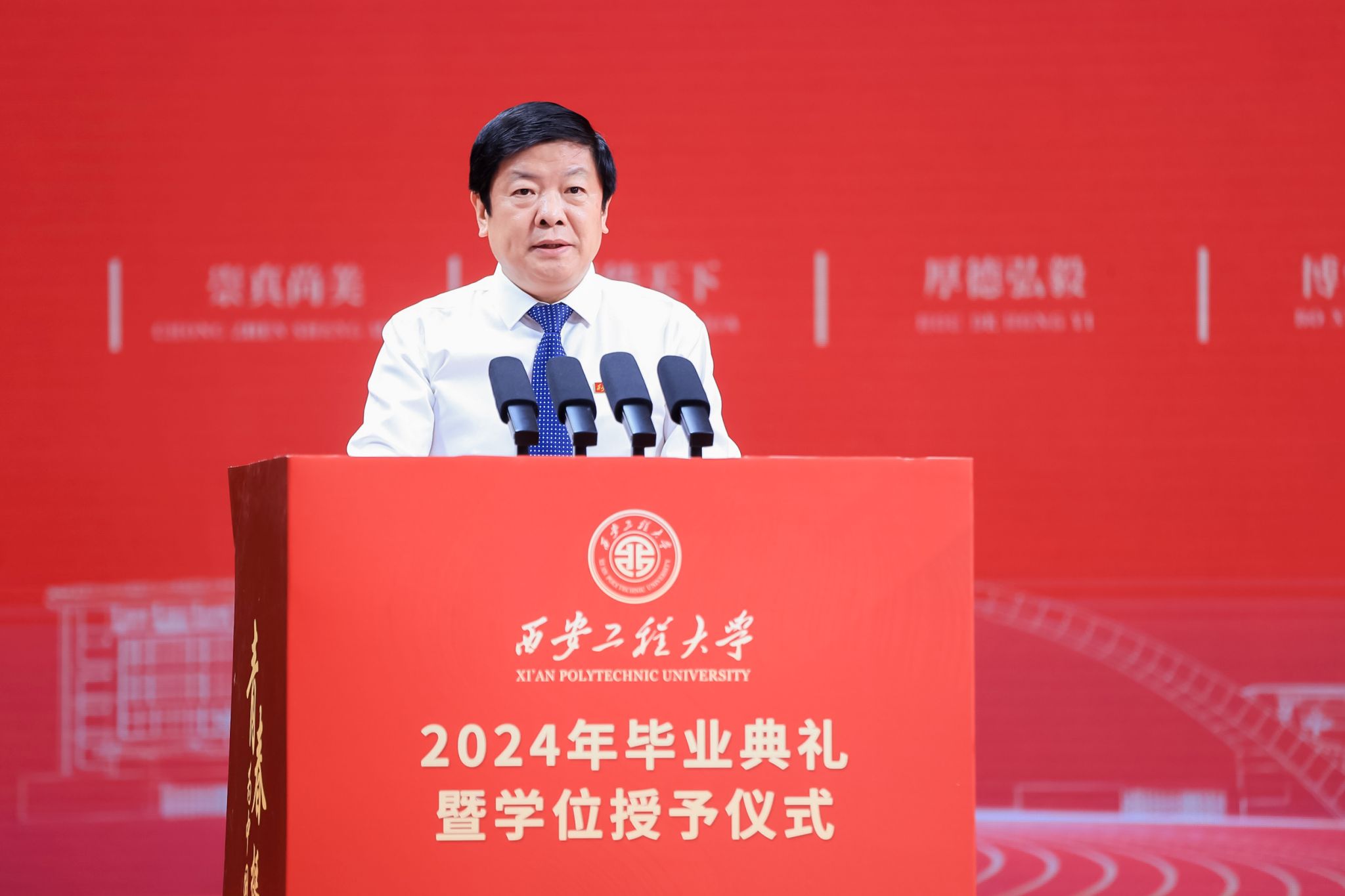 王海燕回顾了这几年师生共同亲历的学校里程碑式的发展,细数了这几年师生共同经历的一场场考验。他指出,2024届同学特别不容易、特别能吃苦、特别敢创新,大家勇攀理想的山峰,最终成为自己想要的模样。站在新的起点上,愿大家永葆真诚、质朴、拼搏、善良的本色,不畏风雨兼程,向着星辰大海扬帆起航,在强国建设、民族复兴的时代潮流中奋勇争先,以青春之作为、青春之风采、青春之力量,奋力谱写为中国式现代化挺膺担当的西工程大学子新篇章。王海燕在寄语中与毕业生深情话别,为即将远行的同学送上母校的叮嘱与祝福:要心中有光,坚守理想;要足下生辉,奋斗不息;要肩上有责,铸就大我。“未来,无论你们走到哪里,西工程大,永远是你们的家。”临别之际,王海燕诚挚祝愿同学们前程似锦、一路生花。