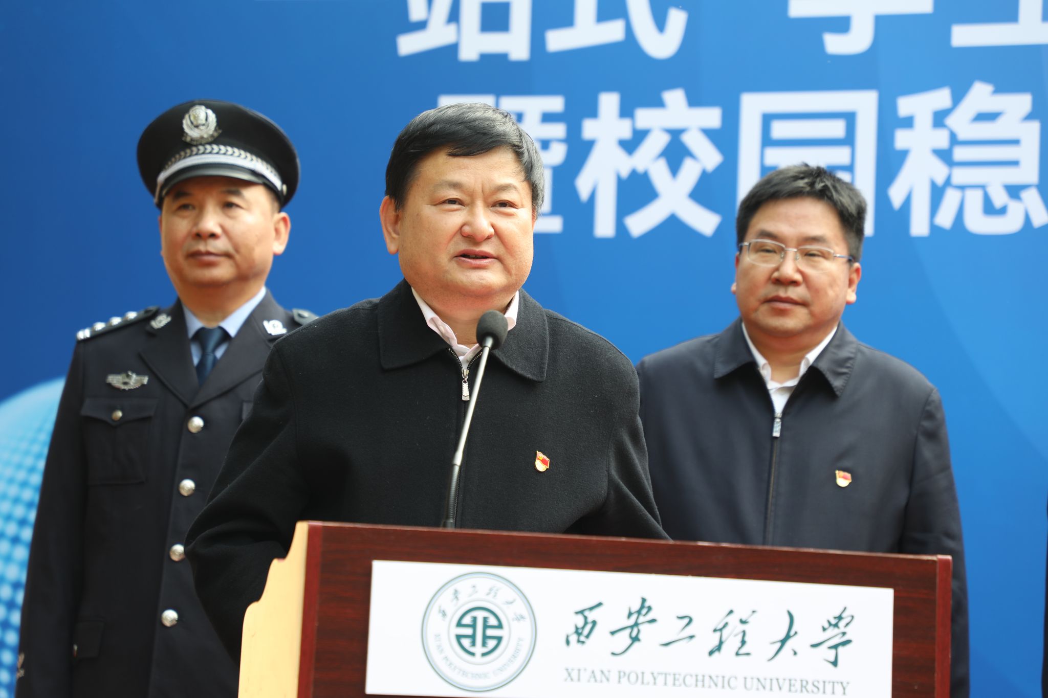 校党委书记马万清在致辞中对西安市公安局、临潼区委区政府、公安临潼分局、西安市文保支队和校园稳定安全专家团专家表示诚挚感谢。他指出,建设校警共建警务室,成立校园稳定安全专家团,是学校认真学习贯彻习近平新时代中国特色社会主义思想和总体国家安全观,坚持和发展新时代“枫桥经验”,在基层治理和社会治安工作中探索深化校地校警共建共治共享机制,完善校园治理体系、加强平安校园建设的重要举措,也是学校践行以师生为中心发展理念的重要体现。学校紧紧围绕“师生需求”这个出发点、牢牢把握“共护平安”这个着力点,力争为师生提供全方位、多角度、零距离服务,在全校形成“一站式”学生社区和“平安校园”建设的高度共识,努力打造具有西工程大特色的“一站式”学生管理模式和“平安校园”建设经验。希望相关单位提高政治站位、强化协同联动、深化“校地融合”,使“一站式”学生社区·校警共建警务室成为预防犯罪的“前沿哨所”、矛盾纠纷的“调解中心”和服务师生的“暖心窗口”,全方位筑牢校园安全防线,营造更加安全、稳定的校园环境。