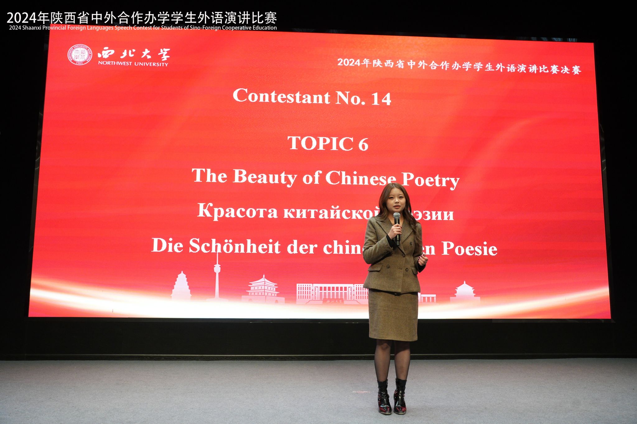 本次大赛由陕西省教育厅主办,陕西省高等教育学会中外合作办学分会和西北大学承办。大赛主题是“传承中华文脉、铸就文化自信”,旨在掀起全省中外合作办学机构(项目)学生的学习热潮,激发广大青年学生爱党、爱国热情,彰显中外合作办学学子优秀风采,引导青年学子用责任与担当讲好中国故事,传播好中国声音。根据大赛规则,省内各中外合作办学机构(项目)在本校在读学生中进行选拔推荐,所推荐选手录制视频参加大赛初赛。根据初赛表现,经专家评审确定入围决赛。决赛中,选手经过有备演讲第一环节选拔,晋级最终的即兴演讲与问答环节。