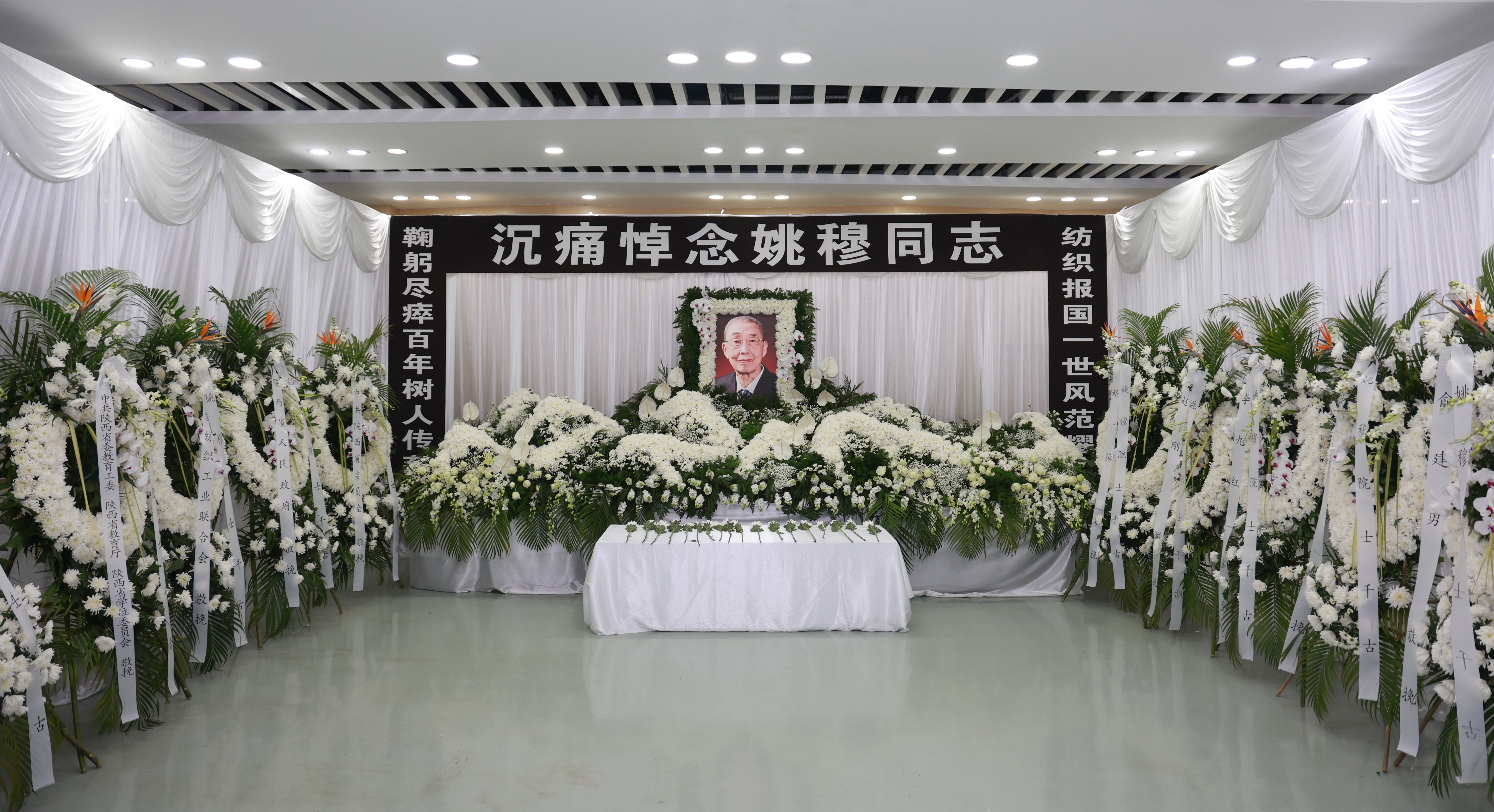 春风哀伤,大地含悲。咸宁厅内庄严肃穆、哀乐低回、哀思无限。“沉痛悼念姚穆同志”横幅悬挂在遗像上方,挽联“鞠躬尽瘁百年树人传薪火,纺织报国一世风范耀山河”高悬两侧,真实映照了姚穆院士殚精竭虑、勤勉奉献的一生。姚穆院士遗体覆盖党旗,安放于鲜花绿柏丛中,花圈拥簇四周。屏幕播放着姚穆院士生前工作和生活的珍贵影像。
