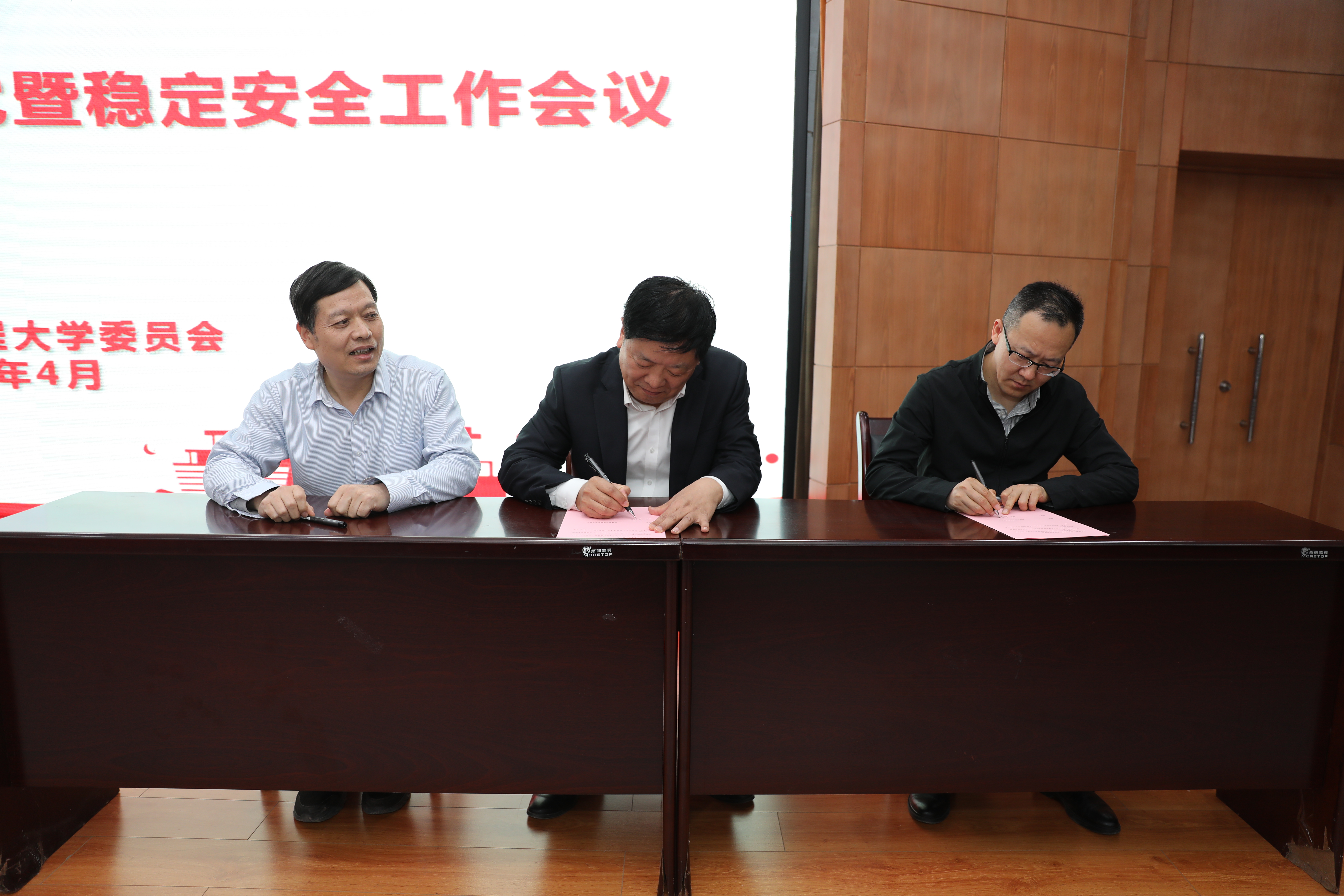 会上,马万清、王海燕、副校长夏蔡娟分别与相关单位负责人签订稳定安全责任书、消防安全责任书和实验室安全责任书。与会人员集体观看了警示教育片。