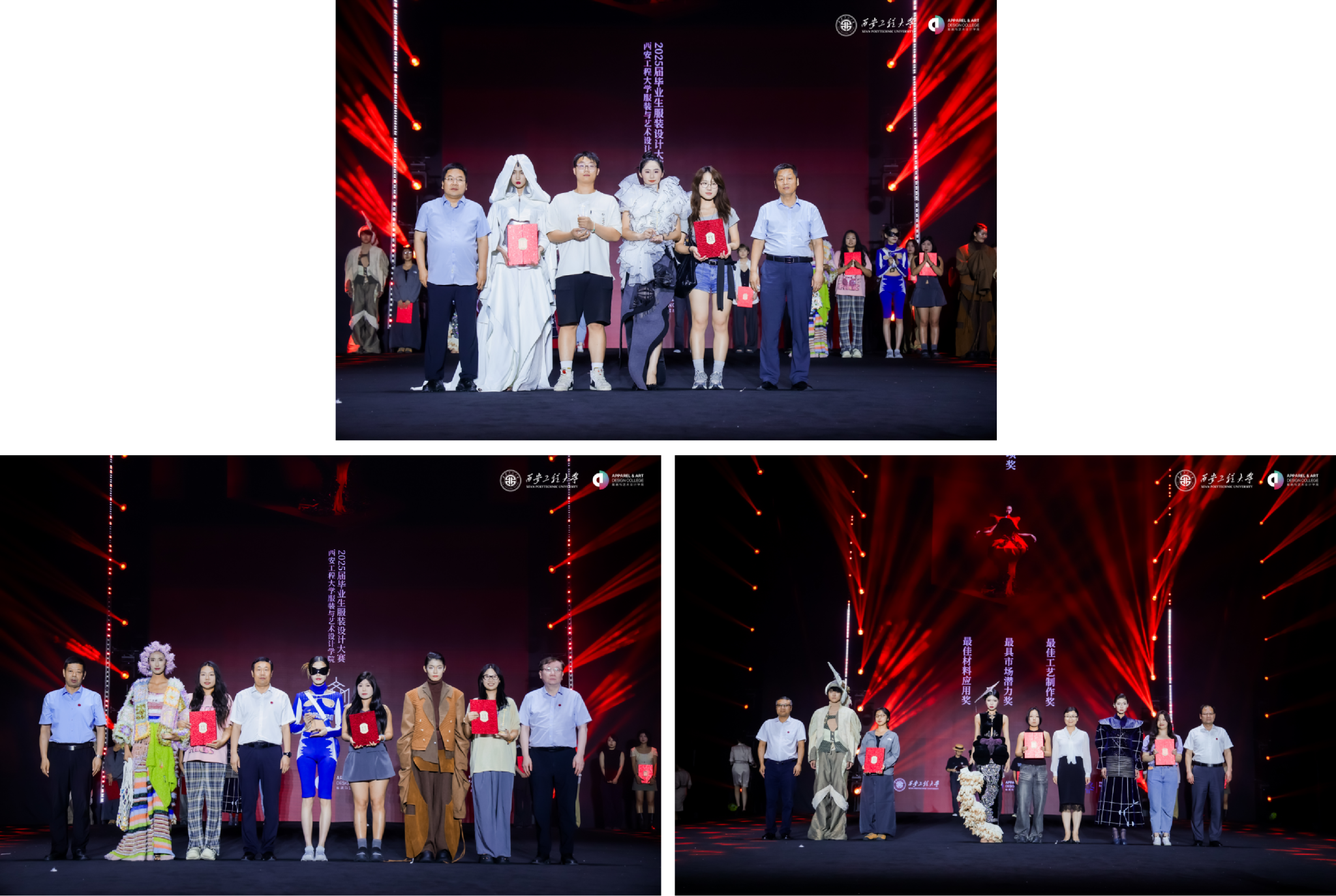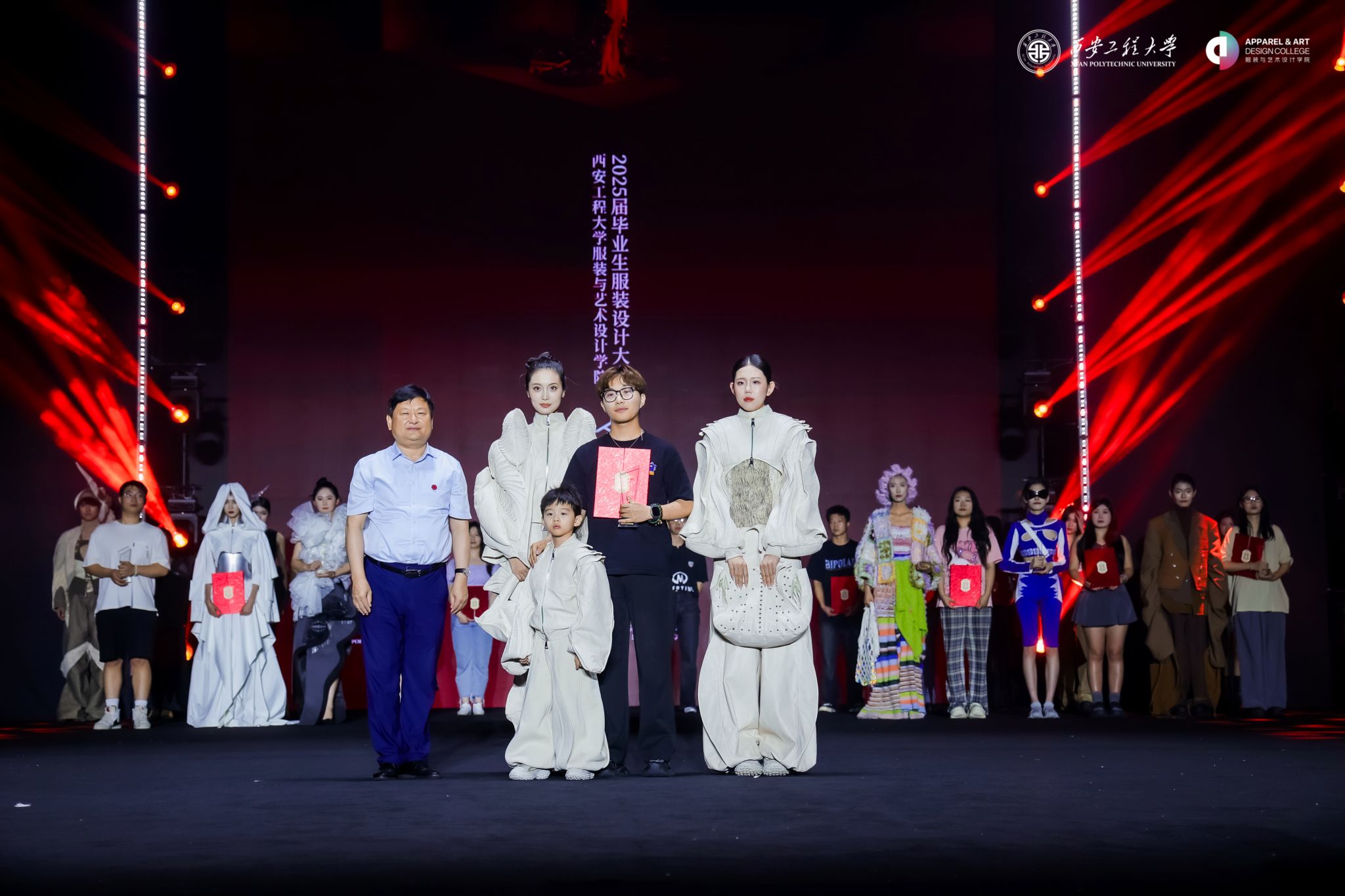 本次毕业设计的灵感源自《庄子・齐物论》,强调“万物齐一、共生平等”的哲思。毕业生们将“长安”这一文化象征与周秦汉唐四代的文化意象融入设计,构建跨越时空、融合古今的多元文化语境,激发社会对传统与当下、个体与世界的深度思考,充分展现学院“艺术+科技+文化”的育人特色。大赛邀请西安美术学院陈霞教授,上海未甲文化传媒有限公司总经理姜伟辉、西安唐晟玖合品牌管理有限公司董事长钱垚等业内专家担任评委。大赛最终评选出一等奖1名、二等奖2名、三等奖3名、优秀奖10名。校党委书记马万清为一等奖获得者李昊天颁奖;校领导为二等奖获得者张霄璇、徐丛鑫,三等奖获得者王乐乐、张珂清、张悦嘉,最佳材料运用奖获得者王芗泽、最具市场潜力奖获得者徐佳蕊、最佳工艺制作奖获得者黄祖铱颁奖;学院领导为优秀奖获得者颁奖。