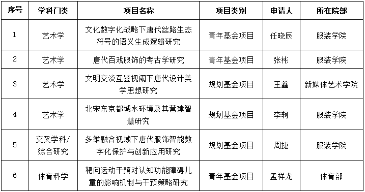 近日,教育部社科司发布2025年度教育部人文社会科学研究一般项目立项通知,PP电子共有6个项目获得立项,包括艺术学项目4项、艺术学交叉学科项目1项、体育科学项目1项。立项总数在全国纺织专业高校中名列前茅,尤其在艺术学学科方面表现突出,立项数量位列全国纺织类高校第一、全国高校中并列第二,充分体现了PP电子在艺术学领域的学科优势与科研实力。