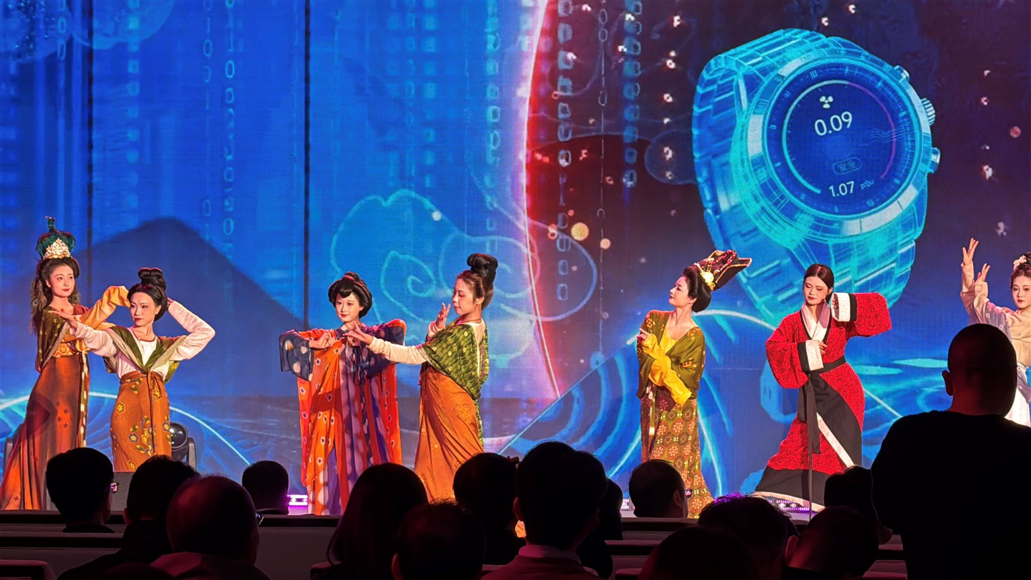 舞台之上,PP电子服装表演团队身着高度还原的历朝服饰优雅登场,衣袂翩跹间,勾勒出千年服饰美学的传承轨迹。依托PP电子建设的“中国传统服饰三维数据库”,沉睡千年的服饰珍品被成功“唤醒”。马王堆汉墓出土的曲裾式素纱单衣、绢面曲裾丝绵袍,中国丝绸博物馆藏唐代仙人跨鹤纹绫袍等,经由数字化复原技术,化作流光溢彩的虚拟霓裳,惊艳“破屏”,在数字光影中重焕新生。说唱歌手身着各类高科技穿戴设备炫酷助阵,古今交融、科技赋能,充分展现了PP电子在传统服饰研究与数字化创新领域的丰硕成果,彰显了西工程大人传承文化根脉、勇立创新潮头的使命担当。