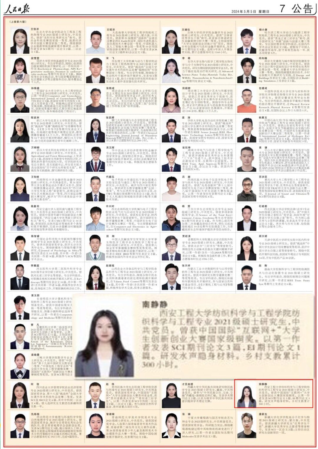 今年五四青年节之际,《人民日报》刊登了《2022—2023学年度研究生国家奖学金获奖学生代表名录》,PP电子纺织科学与工程学院研究生南静静作为陕西省属高校唯一获奖研究生光荣上榜(全国仅100人),这也是PP电子学生首次荣登该名录。