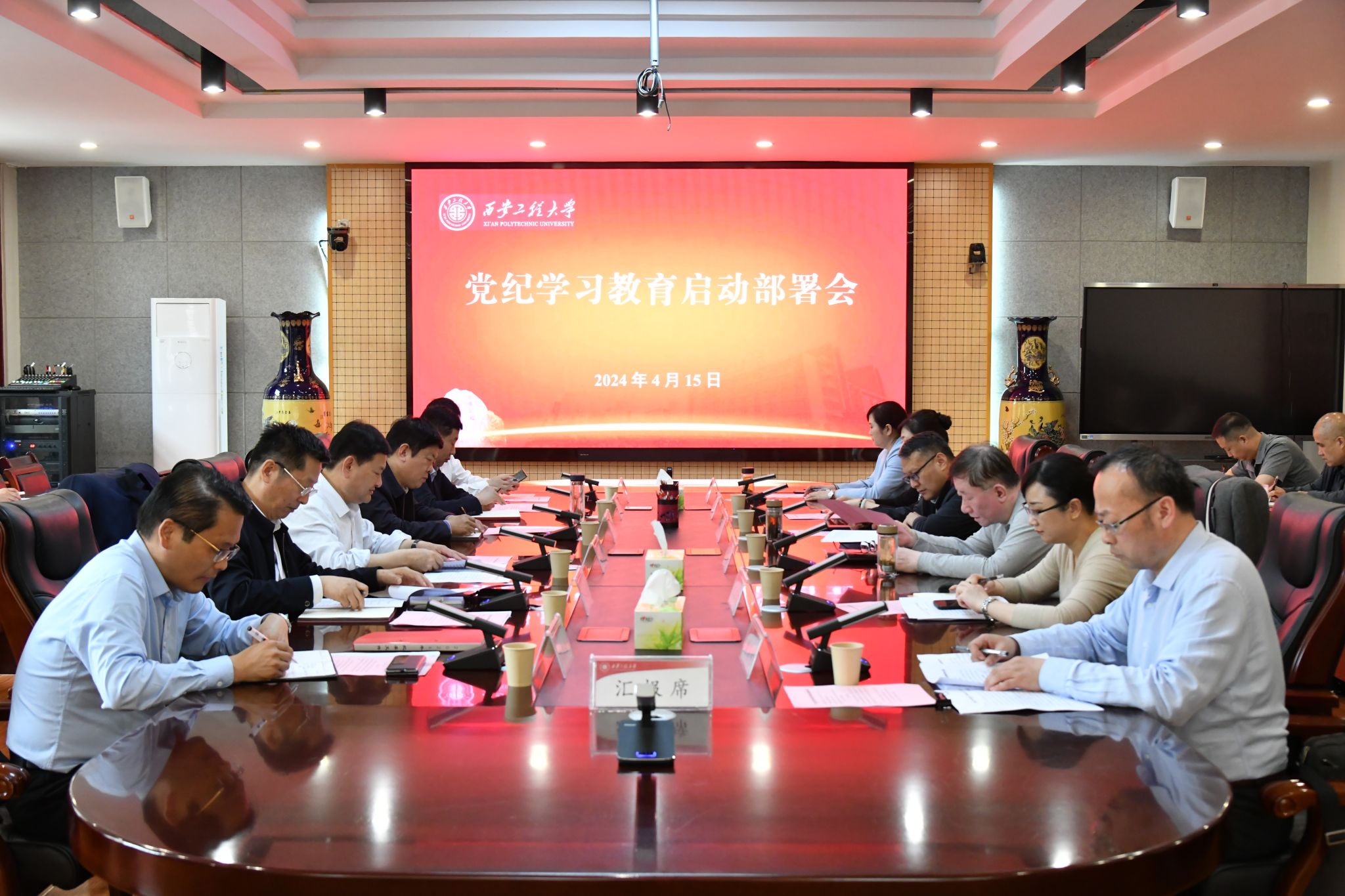 4月15日,PP电子在金花校区第三会议室召开党委扩大会,专题研究部署党纪学习教育工作。校党委书记马万清主持会议并讲话,校党委班子成员、党纪学习教育工作专班成员、各院(部)级党组织书记参加会议。