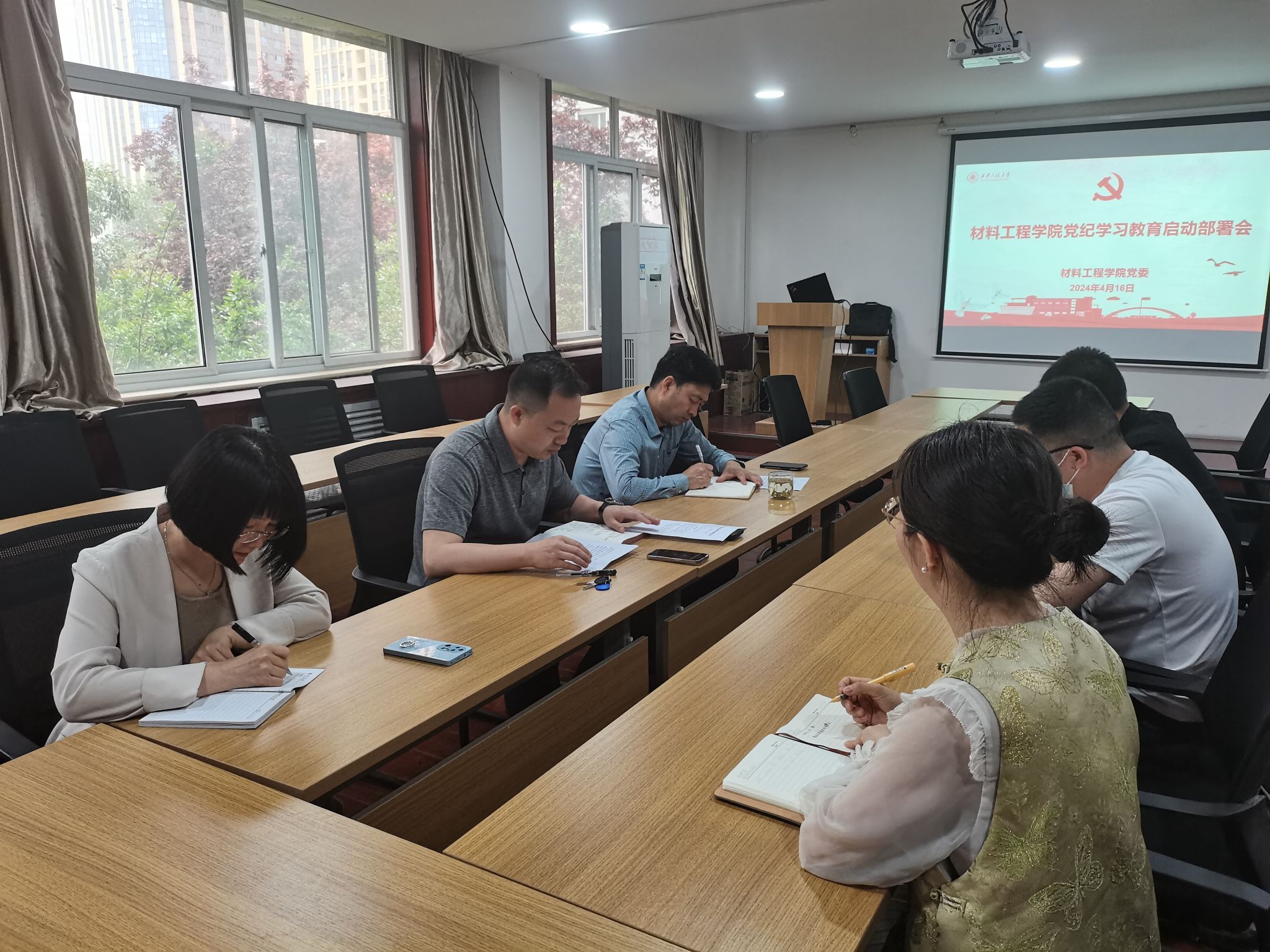 4月16日,材料工程学院党委在学院215会议室召开党纪学习教育启动部署会。学院领导班子成员、党委委员、党支部书记参加会议。会议由学院党委书记赖斌主持。