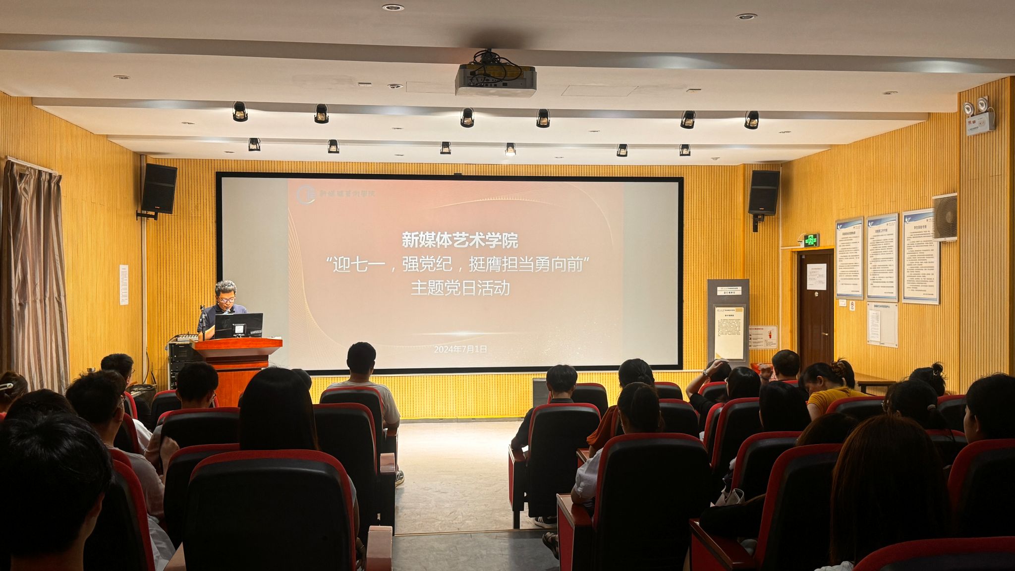 在七一建党节来临之际,为庆祝中国共产党成立103周年,进一步推动广大党员同志用心学纪、准确知纪、自觉明纪、严格守纪,做到将党纪铭刻于心、见效于行,新媒体艺术学院于2024年7月1日下午召开党员大会暨“迎‘迎七一’,强党纪,挺膺担当勇向前”主题党日活动。学院全体党员参加活动,活动由院党委副书记赵文熙主持。