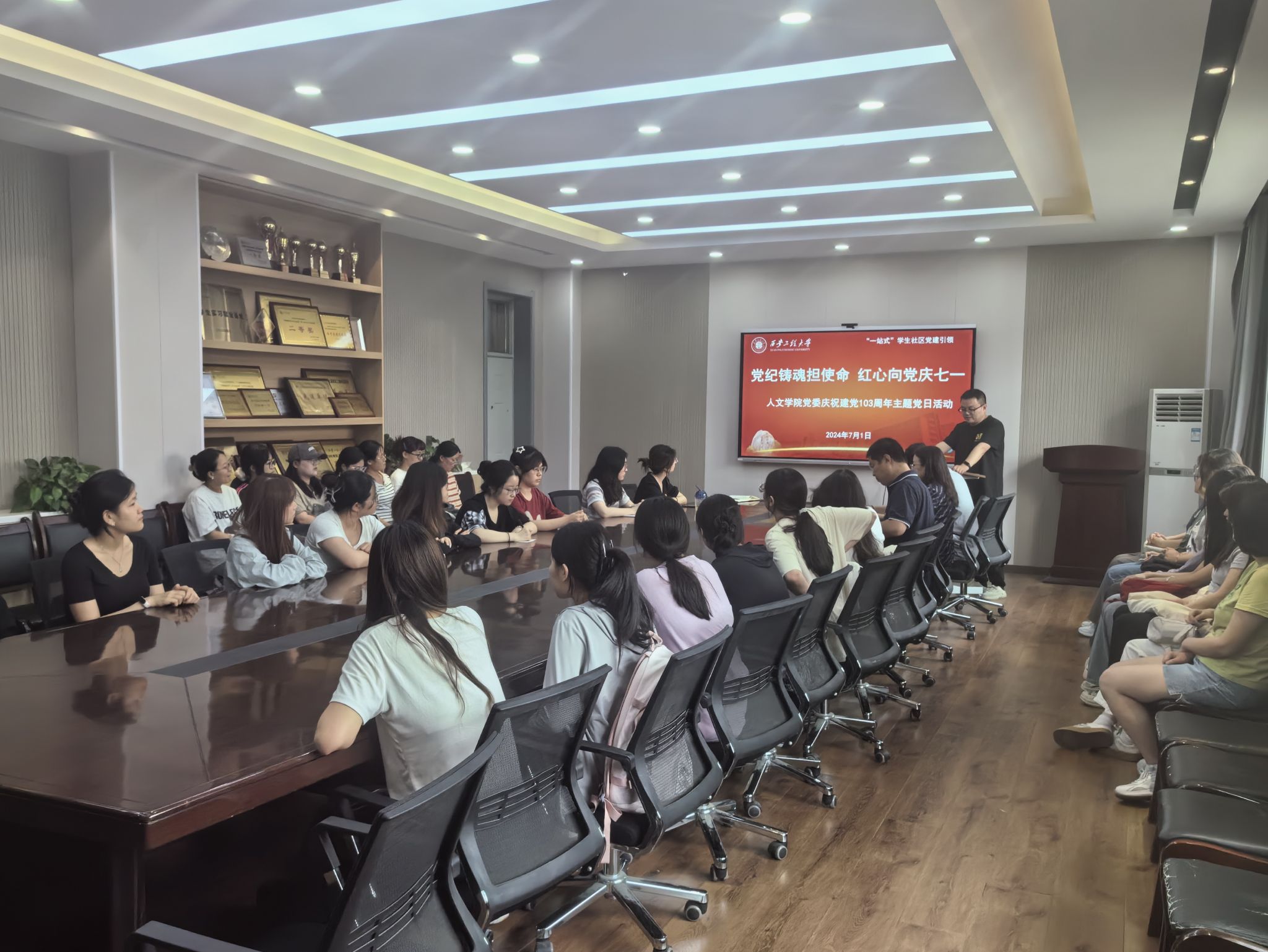 为庆祝中国共产党成立103周年,深入学习贯彻习近平新时代中国特色社会主义思想,进一步推动党纪学习教育走深走实,7月1日下午,人文社会科学学院党委开展“一站式”学生社区“党建引领”之“党纪铸魂担使命红心向党庆七一”——庆祝中国共产党成立103周年主题党日活动。学院党委书记陈莉霞、党委副书记赵立涛、学生党支部书记及支委、全体新发展党员及部分老党员代表参加,活动由组织员王德利主持。