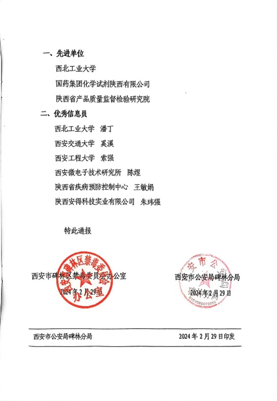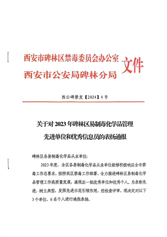 近日,西安市碑林区禁毒委员会办公室、西安市公安局碑林分局下发文件,对2023年碑林区易制毒化学品管理先进单位和优秀信息员进行表扬通报,PP电子实验室管理处索强获评优秀信息员。